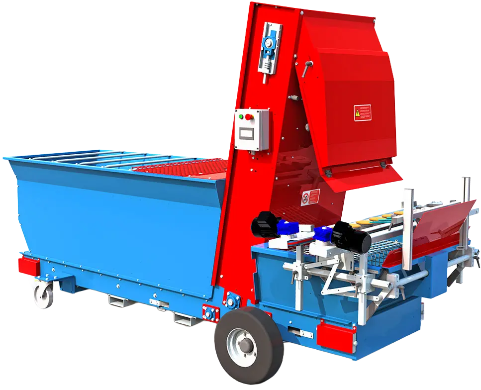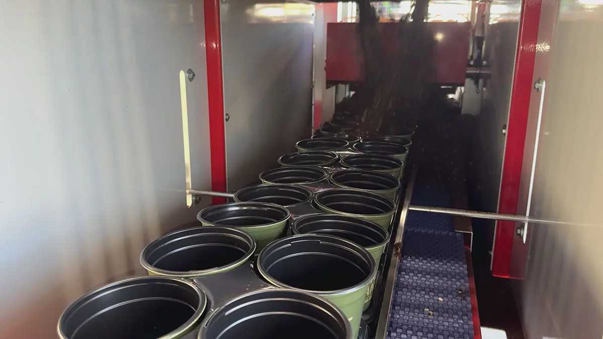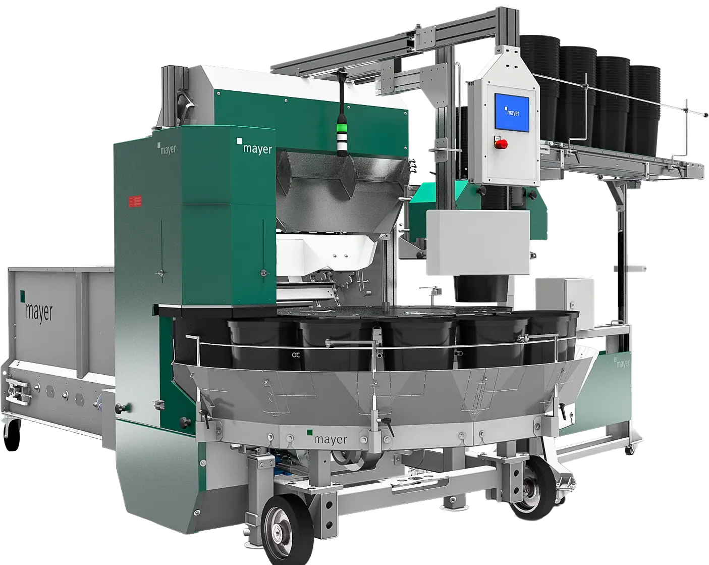 Complete the transplant cycle by automatically and uniformly covering plant collars with soil, bark, miscanthus, rice husk, or similar materials. Up to 5,000 pots per hour. Advanced PLC control allows precise settings for each process, minimizing changeover time between pot sizes. Height-adjustable tube leveler skims excess material and recirculates it—no waste. Pot width adjusts quickly with a single lever. Configurable for right or left side loading. Remote touchscreen control panel.