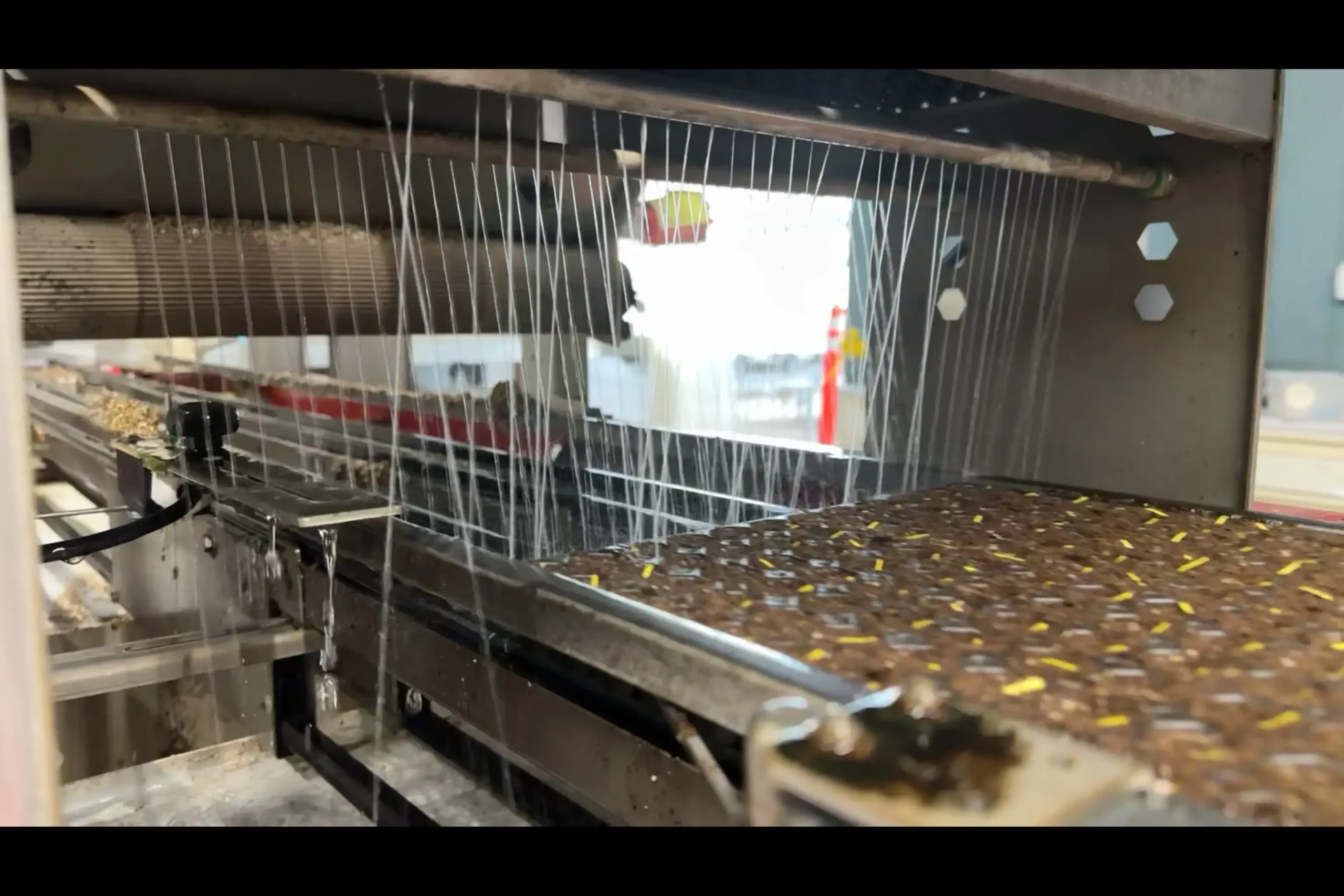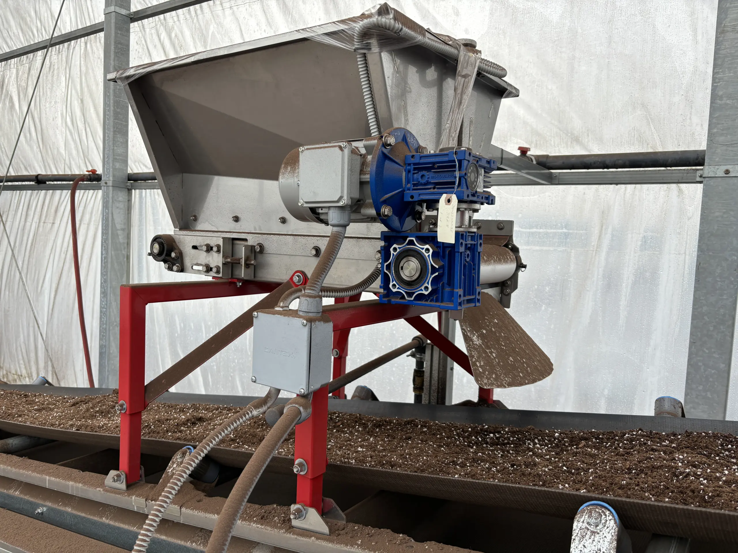 The Covering/Watering Unit enhances any seeding line by applying uniform top coating of media and distributing water evenly across trays as they exit the seeder. Activates only when a tray is detected, reducing waste. Vermiculite drum hopper with adjustable settings controls media flow. Two laser-drilled water bars ensure consistent application for optimal germination. Integrates with Urbinati seeder touchscreen controls. Additional water bars available for expanded distribution requirements.