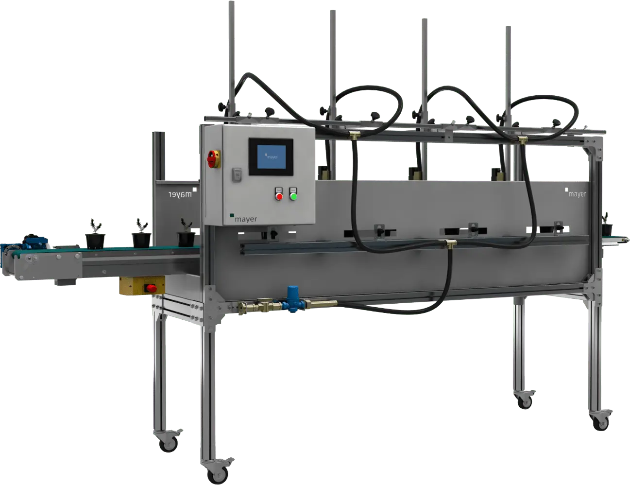 Automate watering for both round and square pots as they move along a conveyor belt. Integrated photoelectric sensors precisely detect each pot, allowing adjustable nozzles to deliver the exact amount of water needed. Touchscreen control provides individual water adjustment for precise irrigation—ensuring optimal water for each plant while minimizing waste. Stainless steel contact surfaces and removable side panels simplify cleaning. Easily integrates into potting machine production lines.