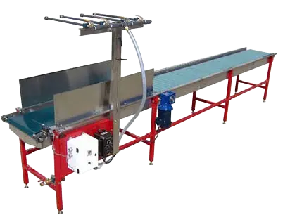 Maximize your pot and tray handling with this customizable buffer table system. Available in lengths from 16' to 39' and 6.5' width. High-quality aluminum profile base, durable multi-layer belt, coated drive and deflection rollers, and weather-resistant galvanized substructure. Push-over unit with straight bar or custom template—optional pneumatic cylinders for triangle pot positioning. Double-bearing push-over ensures stability with heavy pots.