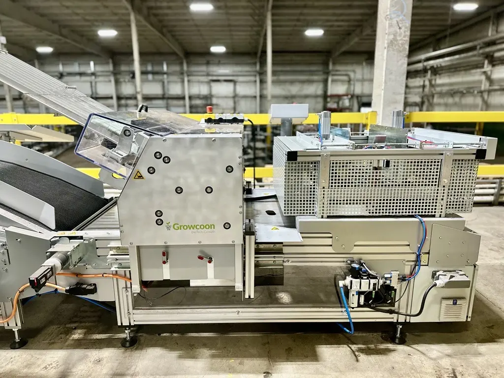 Handles heights from 0.7–2.8" and top diameters from 0.4–3.9" across a wide range of tray and Growcoon combinations. Integrates into existing tray filling lines with optional tray destacker for continuous operation