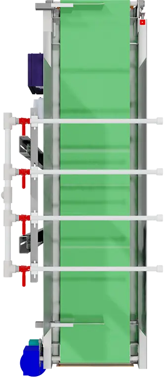 The 7 Foot Water Tunnel provides controlled watering for flats, trays, pots, and baskets. Available with 16″ or 22″ powered conveyor belt with variable speed. Standard 4-bar water manifold and drain pan. Wires into production line controls, watering stops and starts with the line to prevent over/under-watering. Keeps plants uniformly moistened without wasting water. Optional extra wide or tall units accommodate hanging baskets with hangers.