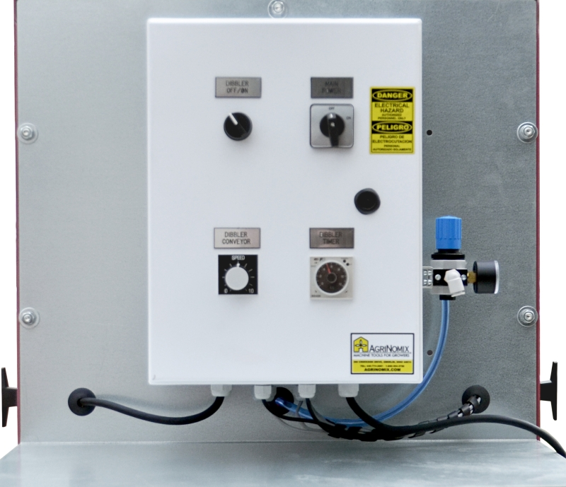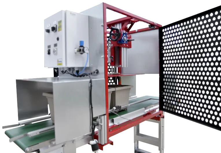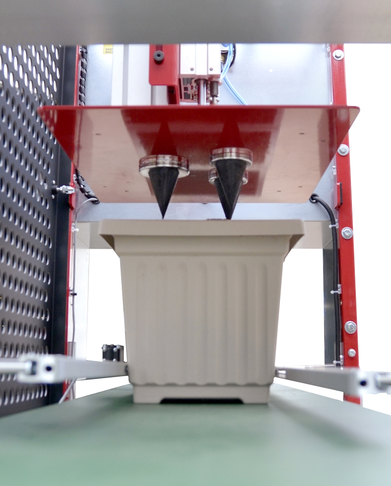 Dibble holes in pots and flats for uniform placement and planting depth at speeds up to 2,800 containers/hour. High-speed pneumatics and precision controls deliver consistent results. Magnetic dibble pins attach quickly to metallic mounting plate for ultimate flexibility and fast changeovers. Set hole locations by positioning pins directly in the pot or tray, then lower the plate with the built-in hand crank. Versatile design meets the demands of high-speed lines with frequent product changes.