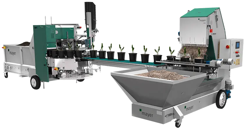 Top your pots with bark or other materials to reduce moss and weed growth for better-quality plants. Parallel belts rotate pots as they advance through the machine, ensuring even material distribution in each pot. A vibrating unit pushes excess material back into the hopper for reuse, while two spring-loaded scrapers remove persistent residue. Frequency-controlled motors adjust continuously for various pot sizes. Configurable for left or right side pot entry; integrates with potting machines.
