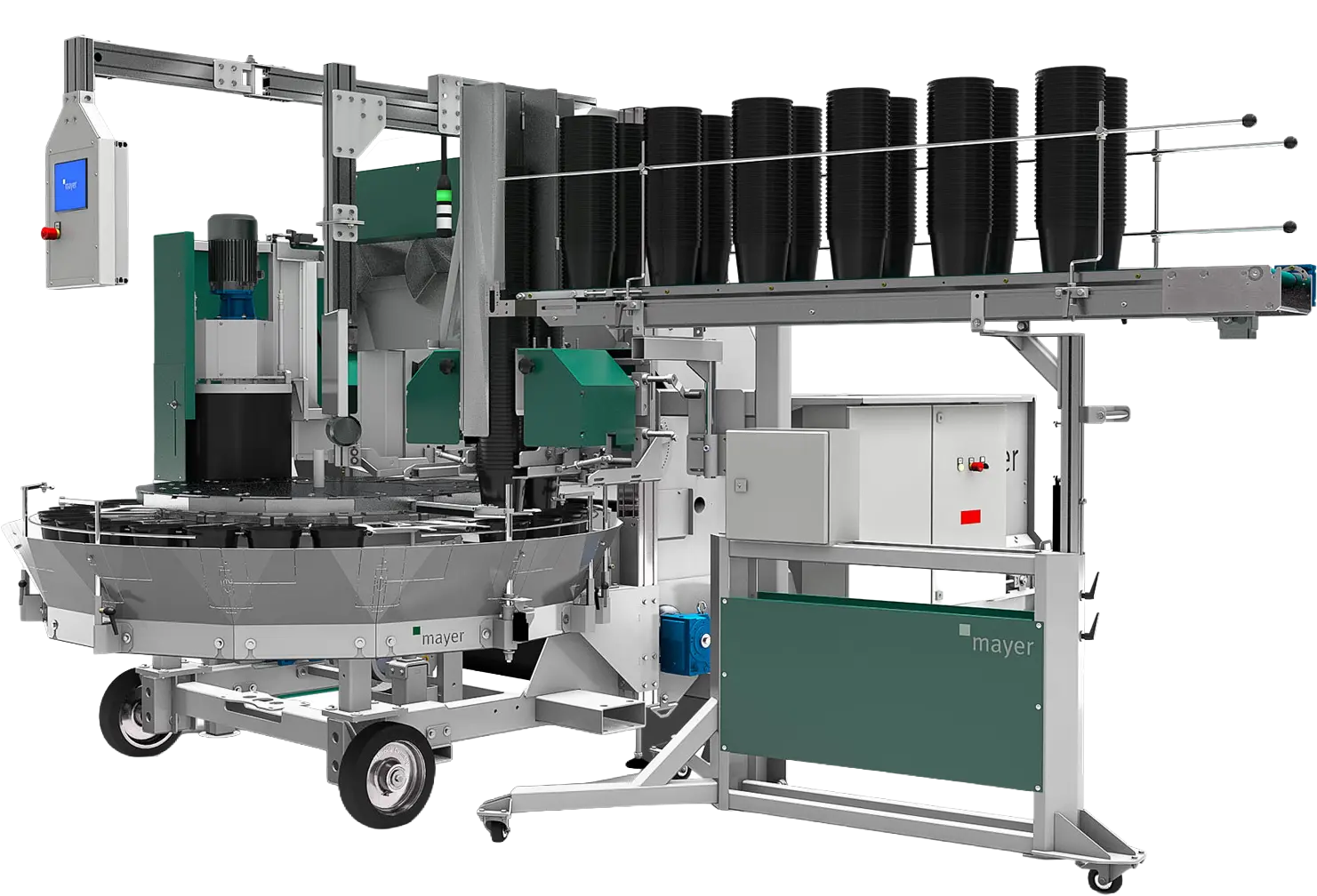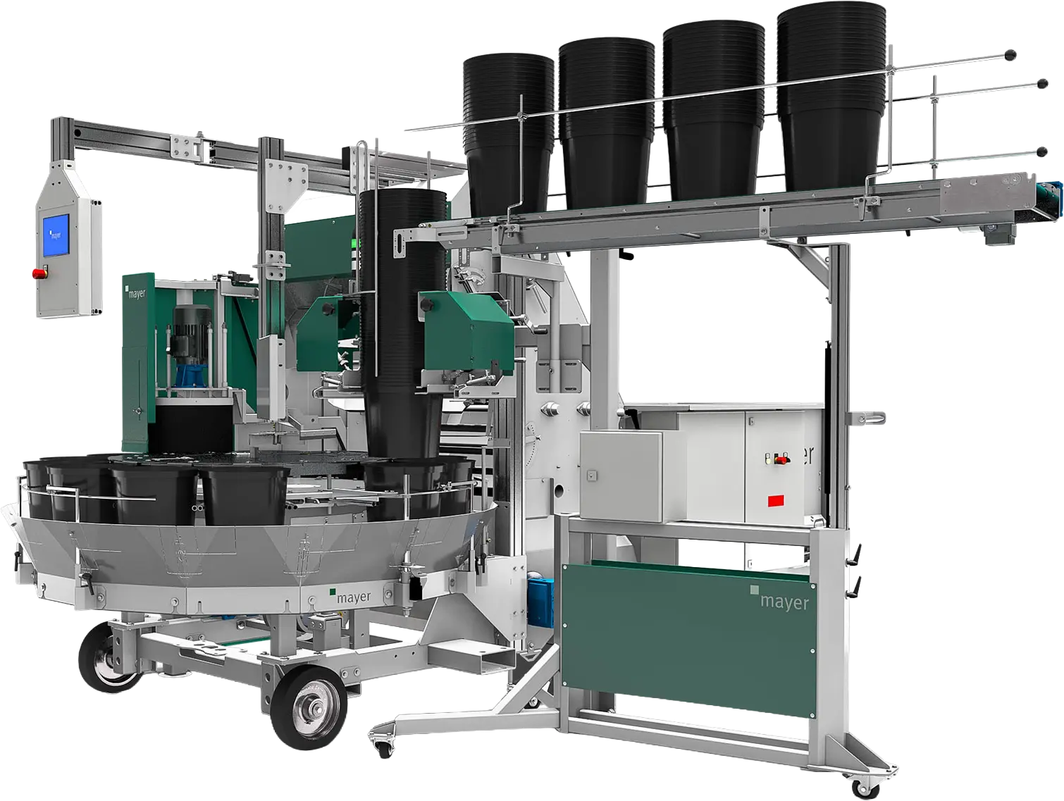 Handles round pots 3.5"–12.5" and square pots 3"–8.5". Drill creates perfectly centered planting holes. Remote-controlled turntable and elevator with frequency control. Compatible with popular automation and transplanting systems. Adjustable conveyor positioning and 3 emergency stops.